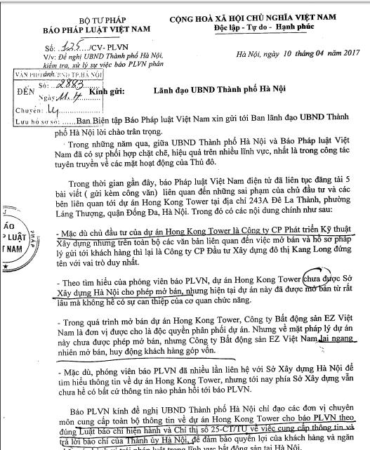 (PLO) - Liên quan đến những sai phạm tại dự án Hong Kong Tower (243A Đê La Thành) mà Báo PLVN đã phản ánh trong thời gian qua, ngày 19/4, UBND Thành phố Hà Nội đã có văn bản gửi Sở Xây dựng Hà Nội, UBND Quận Đống Đa kiểm tra thông, xử lý việc Báo Pháp luật Việt Nam phản ánh.