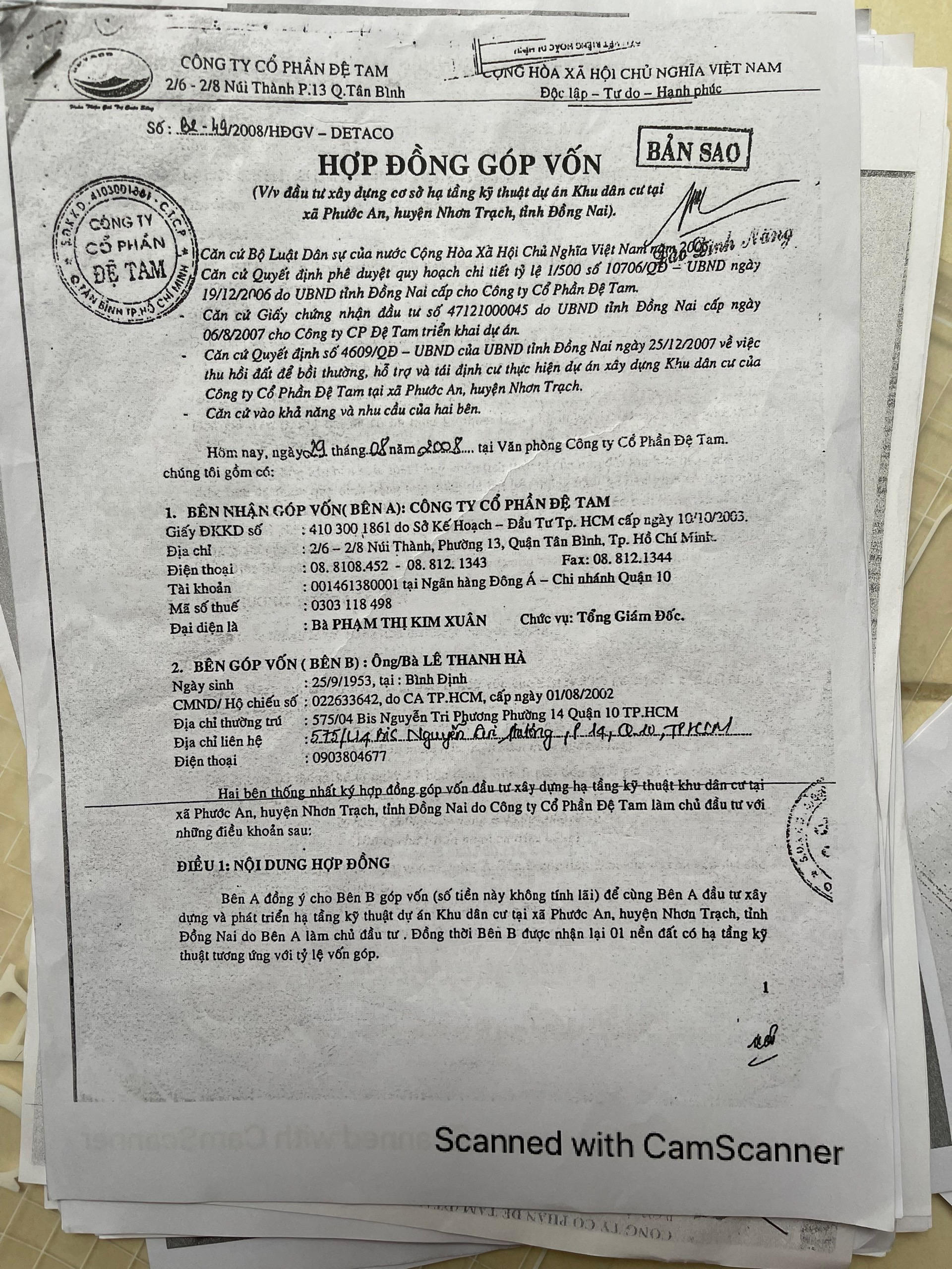 Theo “Hợp đồng góp vốn” B2-49/2008/HĐGV ngày 29/8/2008, ông Hà “góp vốn” và “được nhận lại 1 nền đất” ký hiệu B2-49 diện tích 100m2, giá trị tạm tính 215 triệu đồng. Về “phương thức góp vốn”, chia làm 6 đợt, đến khi “nhận giấy chủ quyền theo quy định hiện hành của Nhà nước”, thì “bên góp vốn” phải “góp vốn” đủ 215 triệu, “vừa khít” giá trị nền đất.