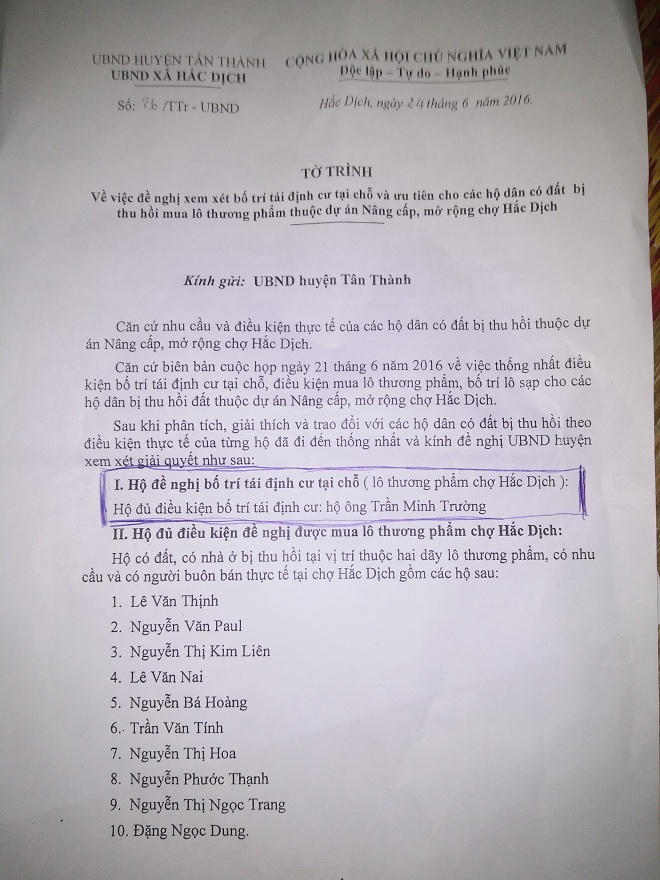 Bà Đoàn Minh Huyền (SN 1974, ngụ ấp 5, xã Hắc Dịch, huyện Tân Thành, tỉnh Bà Rịa – Vũng Tàu) là người duy nhất chưa đồng ý với chính sách thu hồi, bồi thường, tái định cư trong 11 hộ dân tại dự án mở rộng chợ Hắc Dịch. Bà Huyền bức xúc vì nhà mình nằm đối diện khu lồng chợ, không liên quan đến việc xây chợ, nhưng vẫn bị “đè ra” thu hồi với lý do “phân lô thành phẩm đúng kiểu mẫu”.