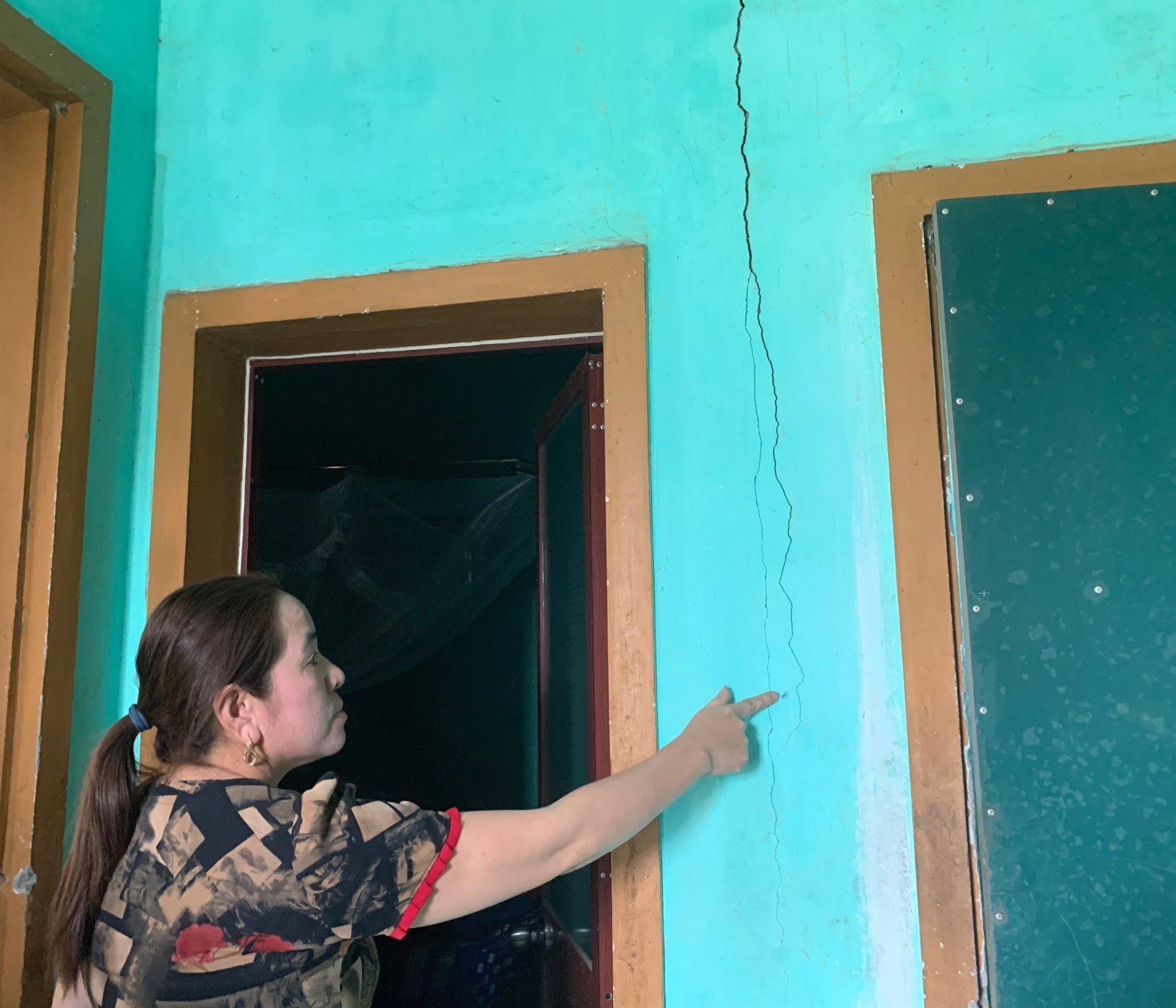 Chị Nguyễn Thị Hằng (ngụ thôn Thanh Lương) chỉ tay vào căn nhà bị nứt và cho rằng những vết nứt này xuất hiện sau khi các nhà thầu tiến hành thi công bằng máy lu rung. Vì vậy, đơn vị thi công cần có các cam kết đền bù thỏa đáng để bà con yên tâm.