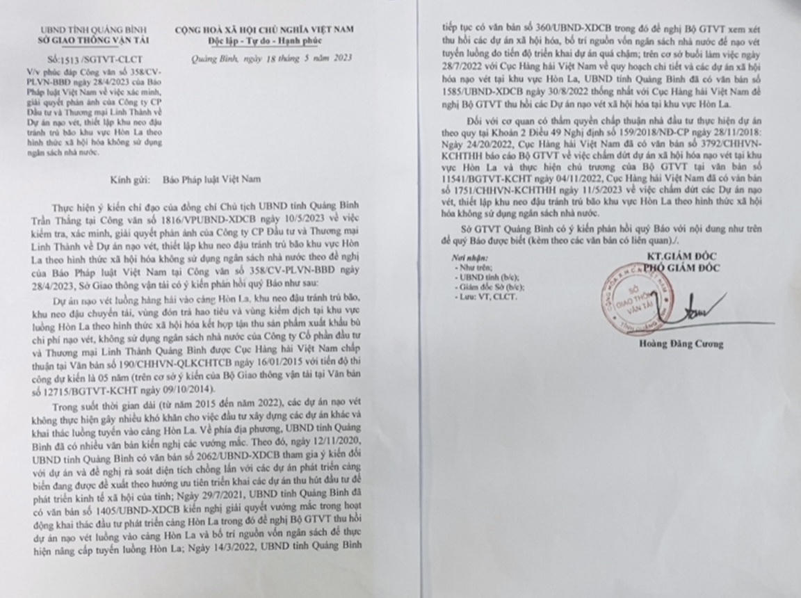 Công văn do ông Hoàng Đăng Cương, Phó Giám đốc Sở GTVT, ký, cho biết: Dự án nạo vét luồng hàng hải vào cảng Hòn La, khu neo đậu tránh trú bão, khu neo đậu chuyển tải, vùng đón trả hoa tiêu và vùng kiểm dịch tại khu vực luồng Hòn La theo hình thức xã hội hóa kết hợp tận thu sản phẩm xuất khẩu bù chi phí nạo vét, không sử dụng ngân sách nhà nước. Dự án này của Cty Linh Thành được Cục Hàng hải (Bộ GTVT) chấp thuận tại Văn bản 190/CHHVN-QLKCHTCB ngày 16/1/2015 với tiến độ thi công dự kiến 5 năm (trên cơ sở ý kiến của Bộ GTVT tại Văn bản 12715/BGTVT-KCHT ngày 9/10/2014).
