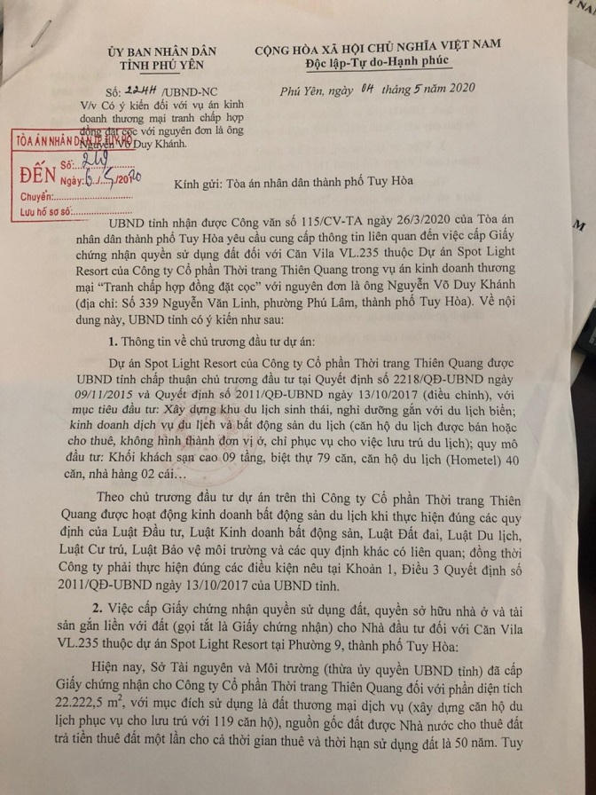 Tuy nhiên, ngày 04/5/2020 UBND tỉnh Phú Yên có Công văn số 2244/UBND-NC trả lời Toà án nhân dân thành phố Tuy Hoà về việc chưa có quy định về việc tách thửa, cấp giấy chứng nhận từng căn biệt thự của Dự án.