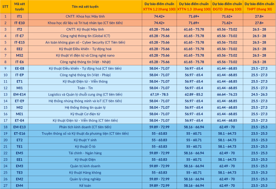 Căn cứ theo các loại phổ điểm và dữ liệu tuyển sinh các năm trước đây, Đại học Bách khoa Hà Nội dự báo mức điểm trúng tuyển vào các chương trình đào tạo đại học chính quy năm 2025 như sau: