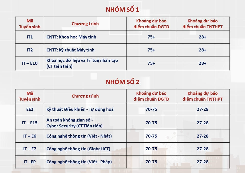 Năm 2024, chương trình đào tạo của Đại học Bách khoa Hà Nội có điểm chuẩn dự báo cao nhất (28 điểm trở lên) thuộc về lĩnh vực Công nghệ thông tin với ngành: Khoa học máy tính, Kỹ thuật máy tính và Khoa học Dữ liệu và Trí tuệ Nhân tạo.