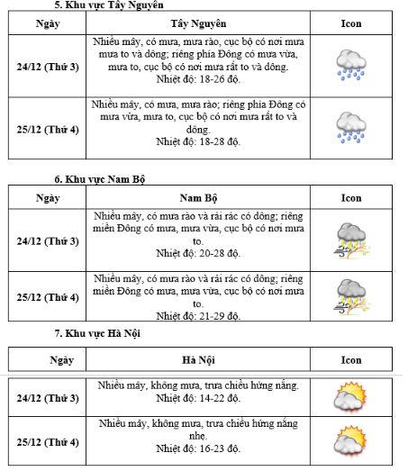 Khu vực đồng bằng Bắc Bộ nhiệt độ thấp nhất dao động 14-16 độ C, ban ngày nhiệt độ 20-23 độ C. Từ đêm 25/12 có mưa, mưa nhỏ rải rác.
