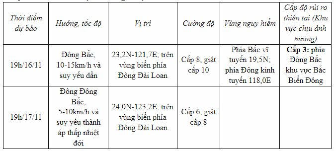 Về cơn bão USAGI gần biển Đông, hồi 19h ngày 15/11, vị trí tâm bão ở vào khoảng 21,7 độ Vĩ Bắc; 120,1 độ Kinh Đông, trên vùng biển phía Nam Đài Loan (Trung Quốc). Sức gió mạnh nhất vùng gần tâm bão mạnh cấp 9 (75-88km/h), giật cấp 11. Di chuyển theo hướng Bắc Tây Bắc, tốc độ khoảng 15km/h.