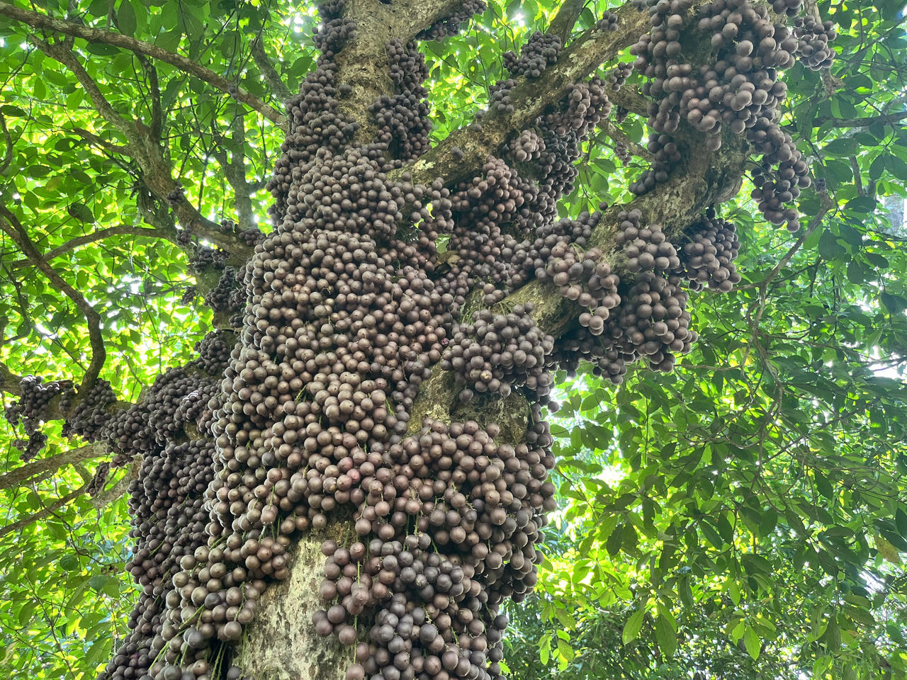 Vào tháng 1 hằng năm, trên các thân cây đỏ nổi lên từng ụ, rồi từ đó nhô ra các chùm hoa, sau đó đậu thành các chùm trái nhỏ màu xam xám sai chi chít. Theo thời gian, các chùm trái đỏ chuyển sang màu tím, rồi qua màu đỏ sẫm. Đến khoảng tháng 9 - 10, trái đỏ căng mọng, bắt đầu chín và chuyển sang màu đỏ rực.