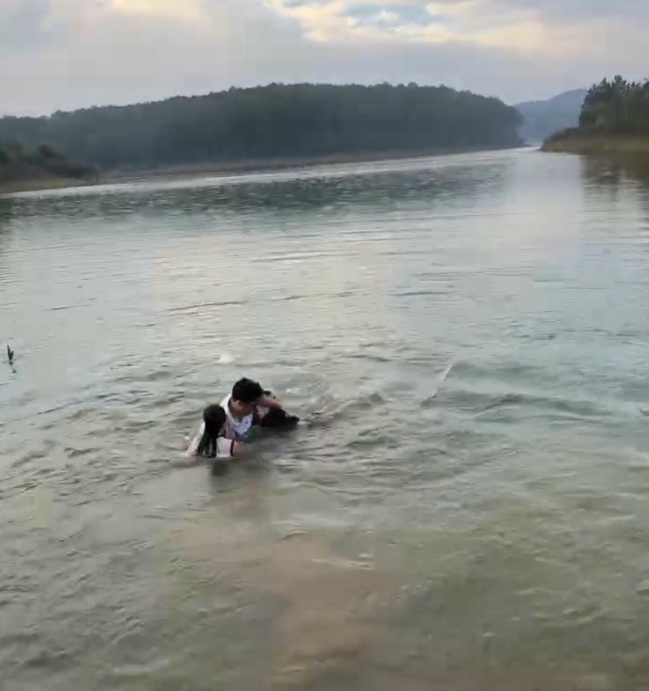 Anh Khải cùng chị Luyến cứu cháu bé đuối nước. Ảnh do người dân chụp lại. |