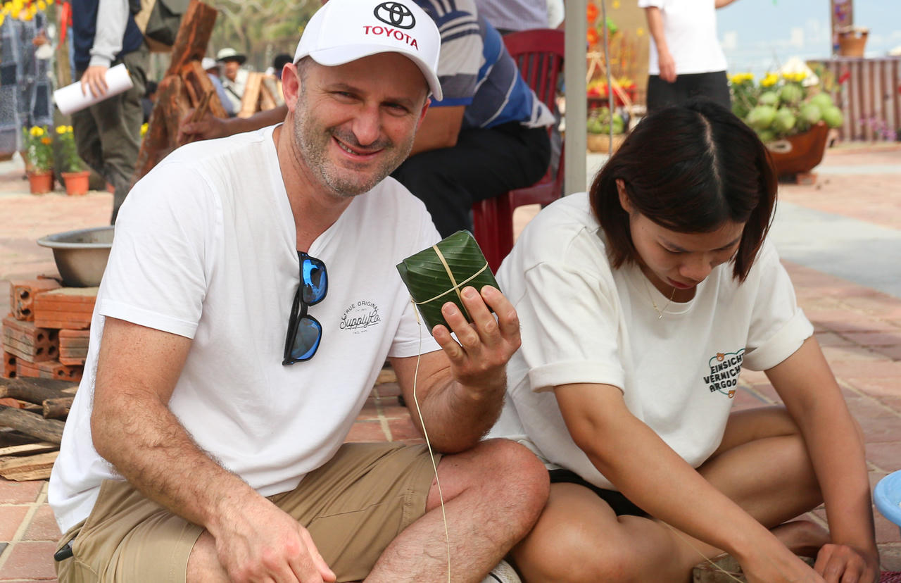 Tham gia trải nghiệm gói bánh chưng, anh Martin Czabel (du khách Úc) chia sẻ: "Đây là lần đầu tôi được tự tay gói bánh như vậy, rất thú vị. Đây chắc chắn sẽ là kỷ niệm khó quên của tôi trong chuyến du lịch đến Đà Nẵng lần này".