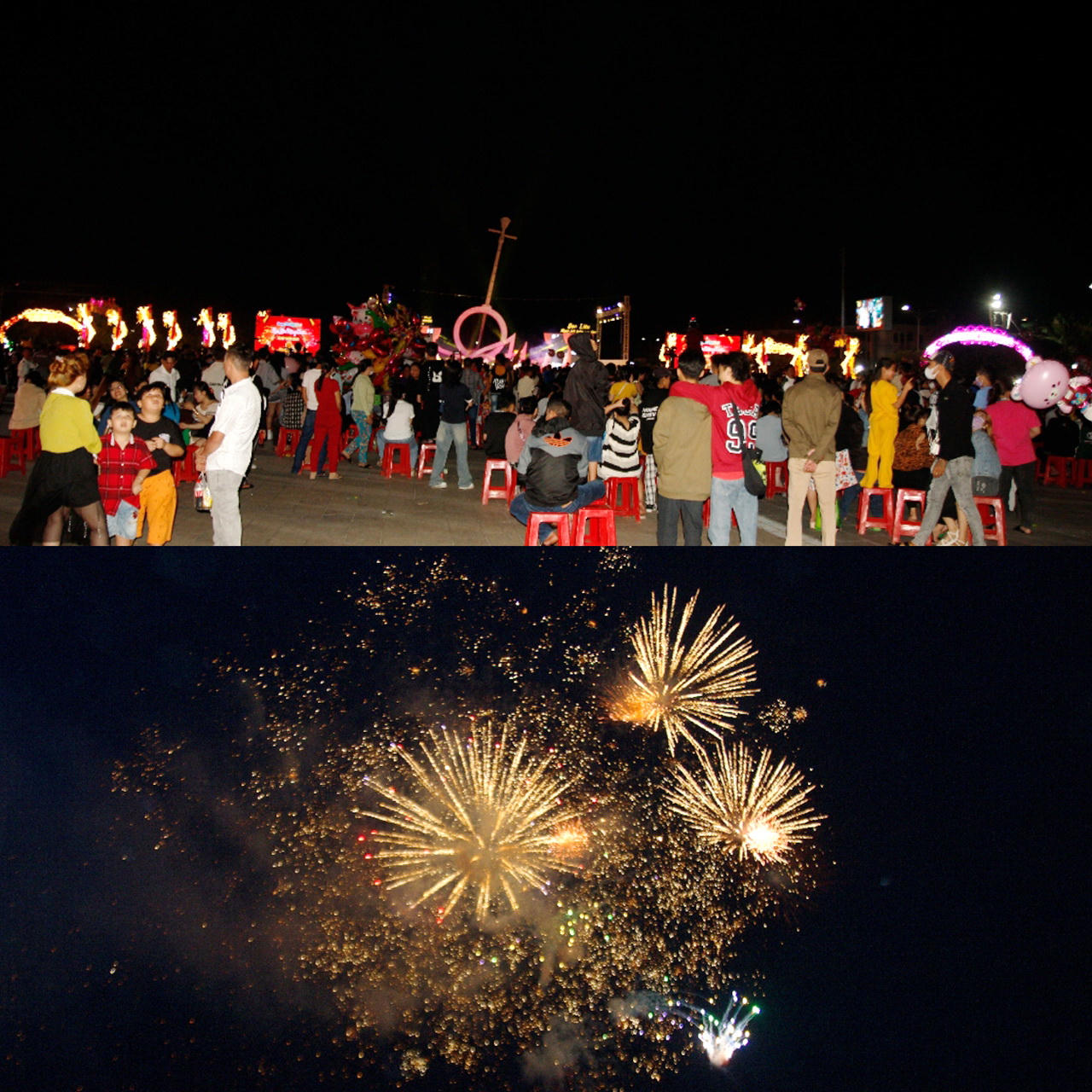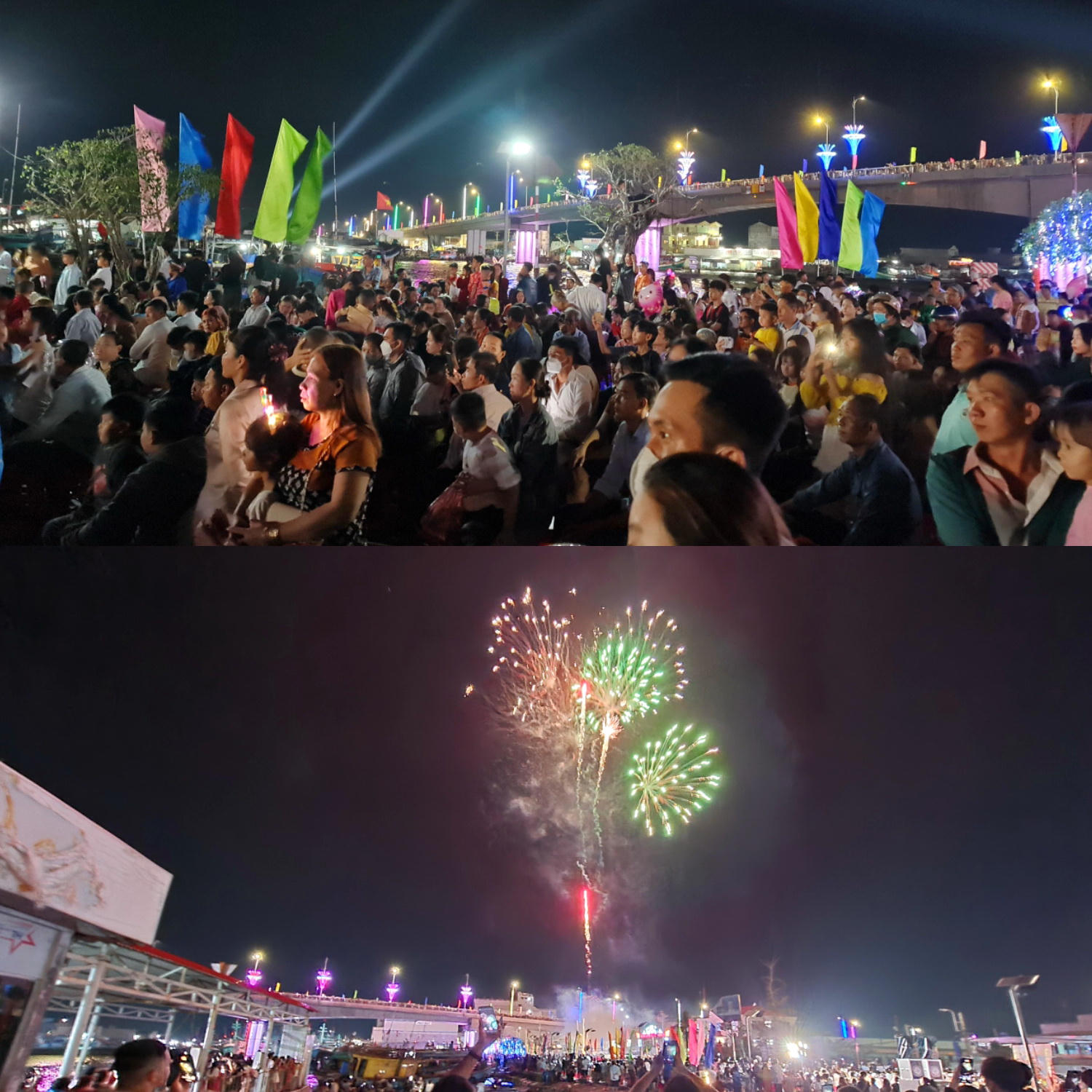 Rất đông du khách chiêm ngưỡng nghệ thuật bắn pháo hoa đón giao thừa tại thị trấn sông Ông Đốc (huyện Trần Văn Thời, tỉnh Cà Mau). |