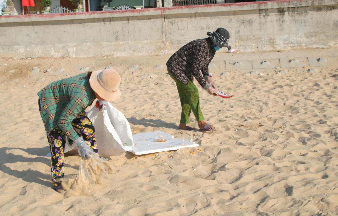 | Người dân Nhơn Hải thu gom rác thải ở bãi biển. |
