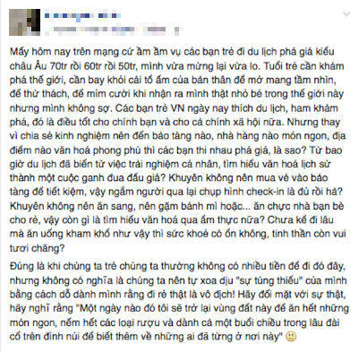Câu chuyện về du lịch giá rẻ đang là một trong những chủ đề gây tranh cãi nhất trong cộng đồng những ngày gần đây. Sau nhiều những chia sẻ về chuyện du lịch giá rẻ của một số bạn trẻ, dư luận cũng có những quan điểm vô cùng rõ ràng.