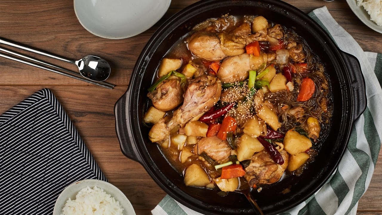 Canh gà hầm Jjimdak thường được nấu cùng với miến và có thể ăn kèm cơm nóng
