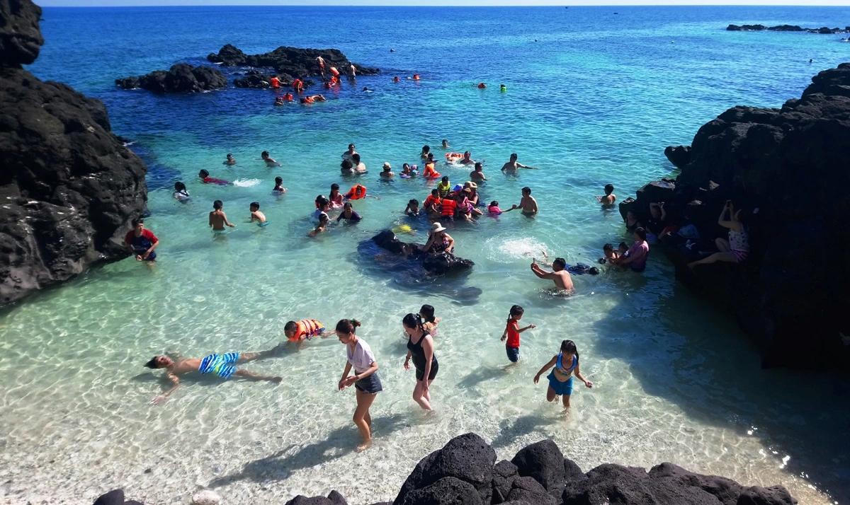 Du khách trải nghiệm bãi biển Lý Sơn tuyệt đẹp. |