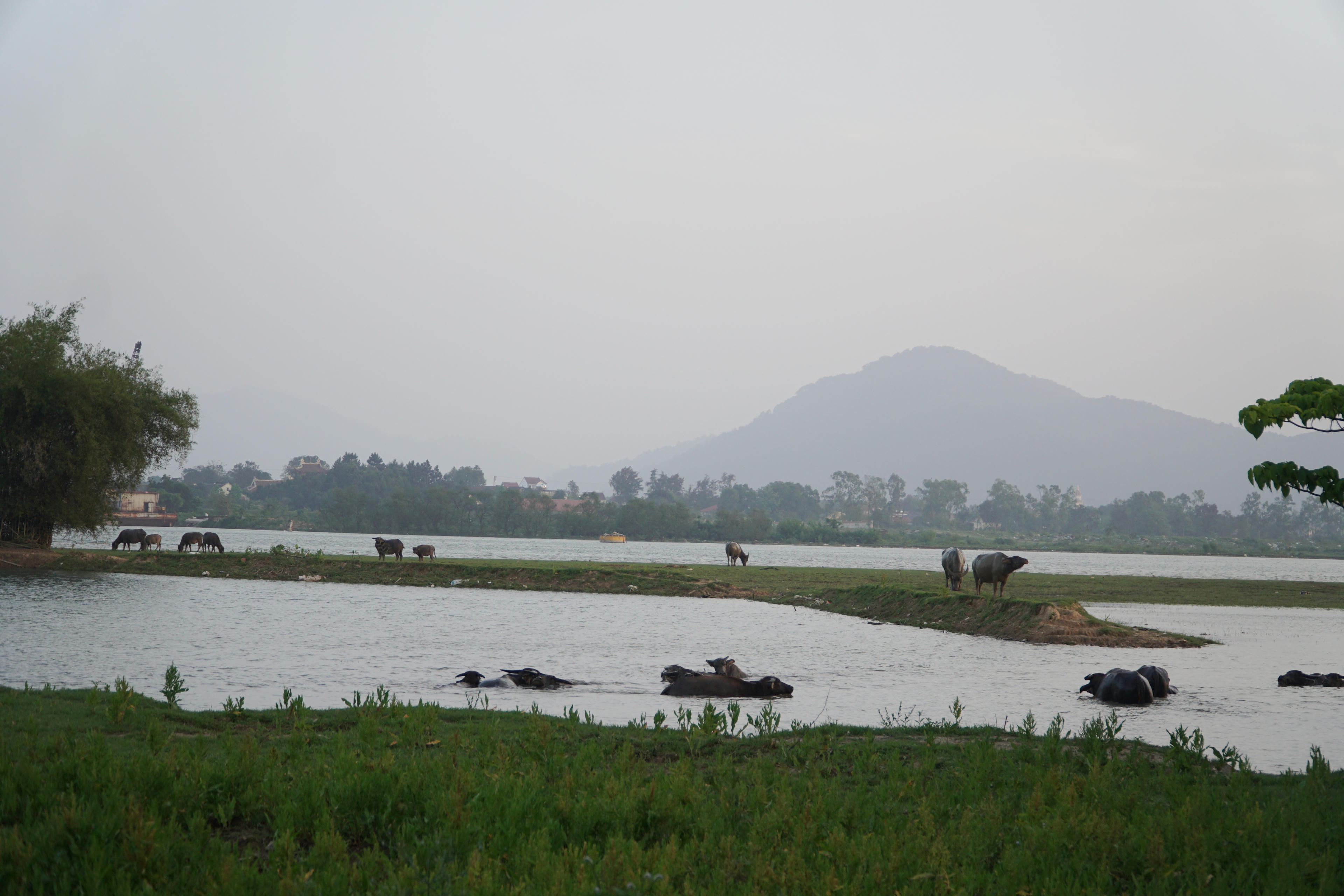 Khung cảnh yên bình với đàn trâu, bò tắm sông trên "làng đảo" Hồng Lam. |