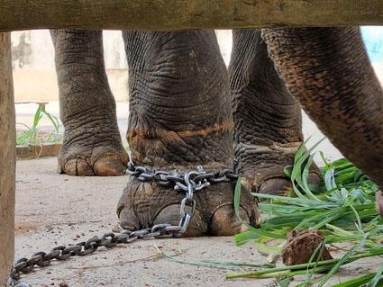 Khi không phải làm việc, voi thường bị xích tại chỗ hay bị nhốt trong chuồng chật hẹp, không đáp ứng được nhu cầu vận động cơ bản. Với trọng lượng trung bình từ 4 - 5 tấn, việc phải đứng quá lâu trên nền đất cứng hay nền bê tông, khiến hệ xương khớp, chân, móng của voi chịu áp lực rất lớn. Nhiều cá thể đã gặp phải tình trạng nứt móng, viêm da, biến dạng chân và các bệnh lý xương khớp.