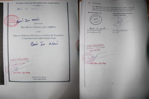 Thứ nhất, bản gốc hợp đồng phân phối độc quyền của Công ty BIO HUMA NETICS và Thuận Phong (bằng tiếng nước ngoài) ký vào ngày 1/10/2013 do đại diện Công ty Thuận Phong là ông Khiếu Mạnh Tường và ông Lyndon W. Smith - Chủ tịch HĐQT & Tổng Giám đốc Công ty BIO HUMA NETICS đứng ra ký kết, ký trực tiếp từng trang và đóng dấu.