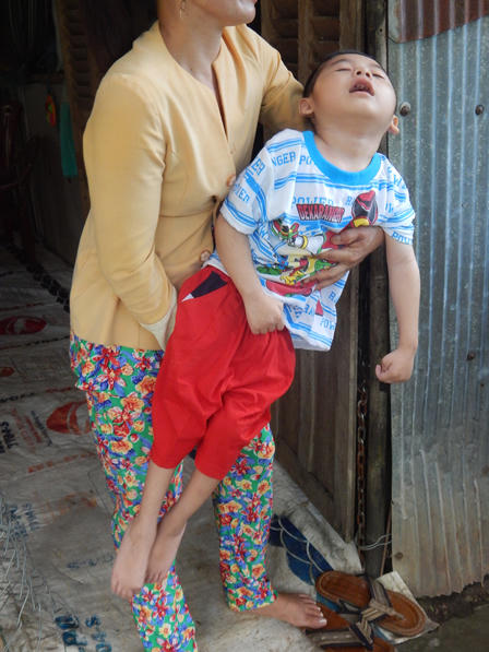 Trên chiếc võng treo ở góc nhà, đứa trẻ 4 tuổi nước da trắng trẻo, nằm bất động trên võng, hai chân cứng đơ, duỗi thẳng, tay co quắp, hai mắt mở to vẻ vô hồn. Chỉ khi người mẹ tiến lại ôm con vào lòng vỗ về, đôi mắt đứa trẻ mới có chút sinh khí.