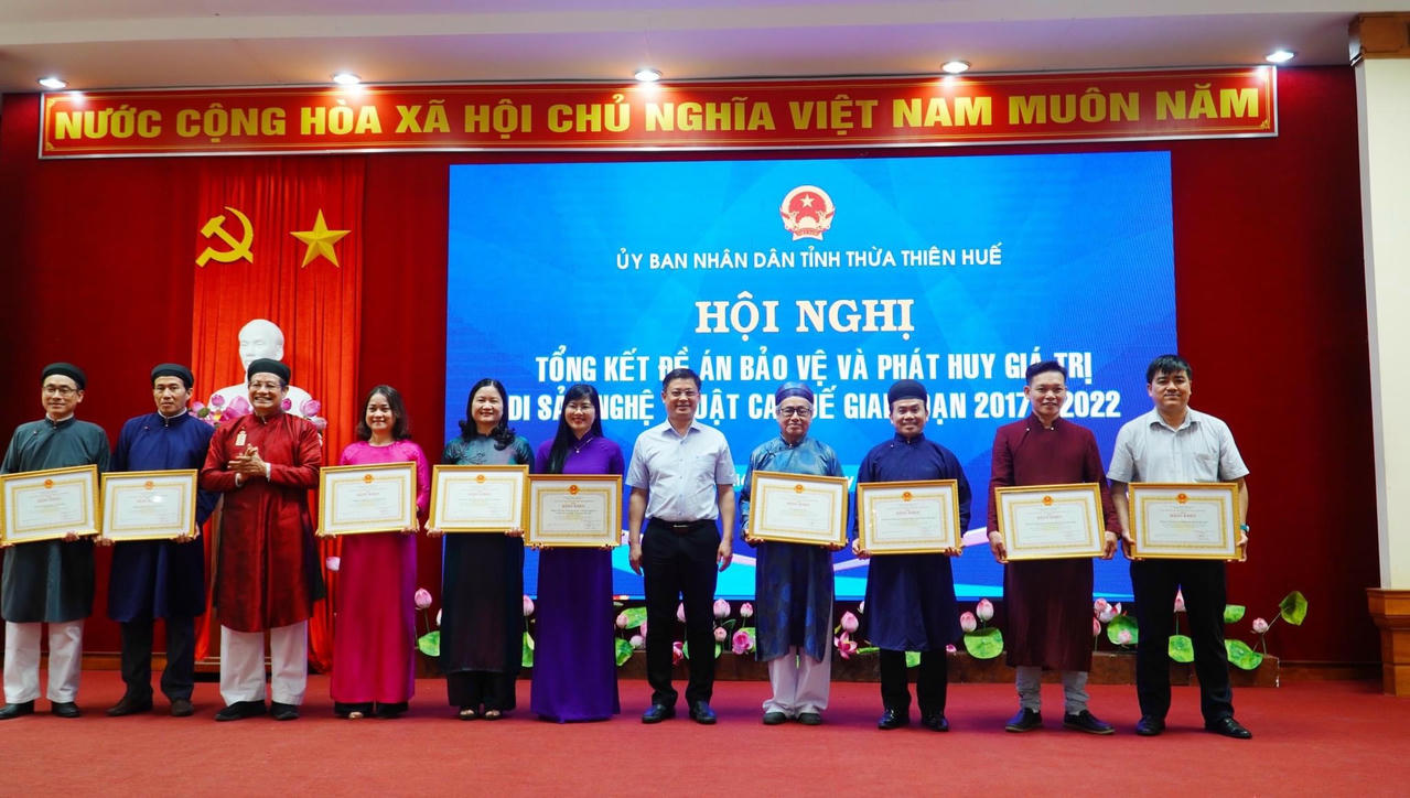 Dịp này, Chủ tịch UBND tỉnh đã tặng Bằng khen cho 10 tập thể và 15 cá nhân đã có thành tích xuất sắc trong việc bảo vệ và phát huy giá trị di sản nghệ thuật Ca Huế giai đoạn 2017 – 2022.