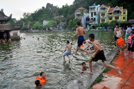Từ những ngày đầu hè, trăm người lớn, trẻ nhỏ đã tới hồ Long Trì để tắm vào mỗi buổi chiều.