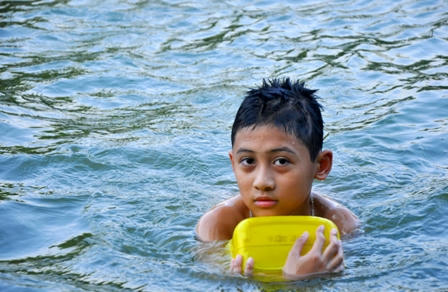 Một bạn nhỏ dùng chiếc can để làm vật nổi bấu víu trong khi tắm.
