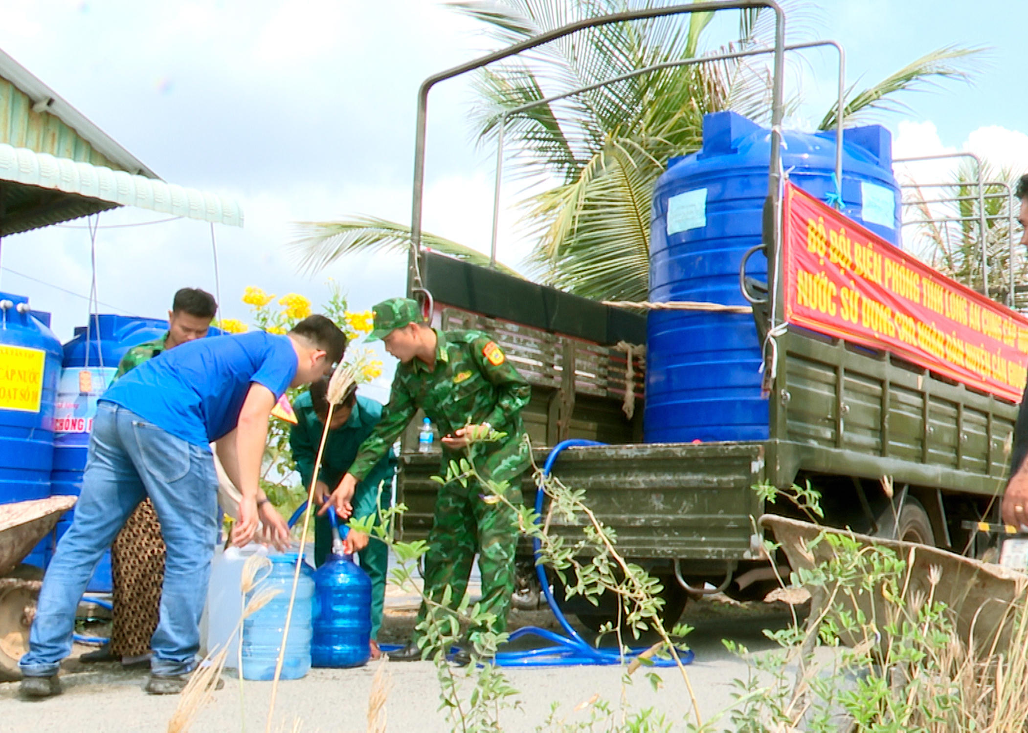 Nhằm giúp các hộ dân bị ảnh hưởng hạn, mặn thiếu nước sạch sinh hoạt hàng ngày trên xã Tân Tập, huyện Cần Giuộc, tại các điểm đến cấp nước, cán bộ, chiến sĩ tổ chức bơm nước từ bồn chứa trên xe vận chuyển ra các dụng cụ chứa của người dân đem đến. Các chiến sĩ cùng cán bộ đoàn tích cực hỗ trợ người dân ràng buộc các thùng, can chứa nước để vận chuyển về nhà. Từng giọt nước sạch mát lành được bà con đón nhận trong niềm vui, phấn khởi trên khuôn mặt giúp vơi bớt cái khó khăn do thiên tai xâm nhập mặn mang lại.
