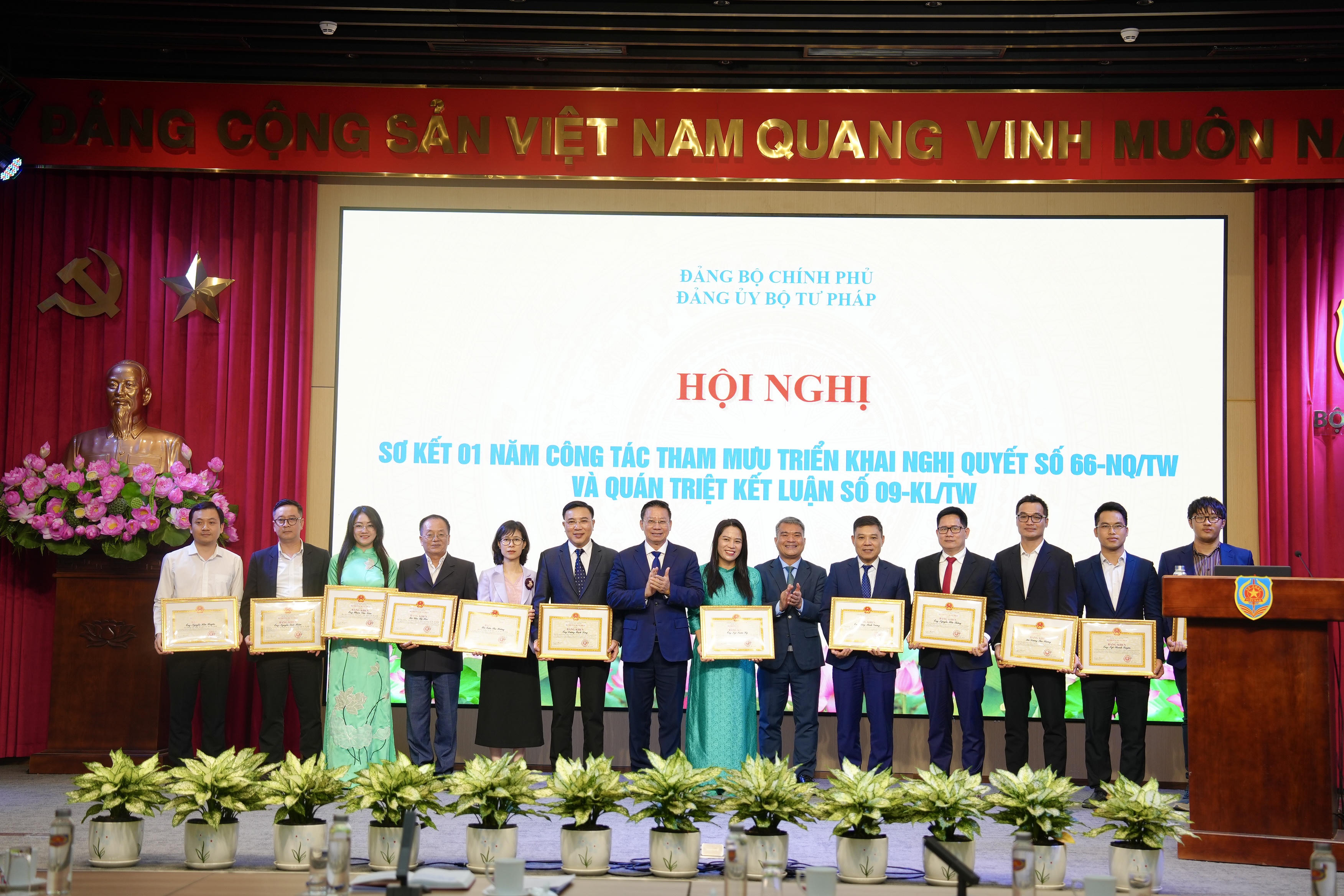 Tại hội nghị, thừa ủy quyền của Chủ tịch nước, Bộ trưởng Bộ Tư pháp đã tặng Huân chương Lao động hạng Ba cho Viện Chiến lược và Khoa học pháp lý đã có thành tích xuất sắc trong công tác tham mưu xây dựng và triển khai tổ chức thực hiện Nghị quyết số 66-NQ/TW.