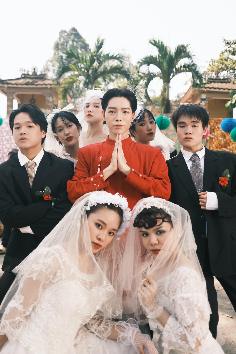 Trong dòng người tấp nập theo chân cô dâu - chú rể, nhân vật của Đức Phúc xuất hiện với gương mặt sáng, nụ cười đặc trưng của mình. Anh gây chú ý với kiểu tóc mái trái tim cùng những biểu cảm hóm hỉnh.
