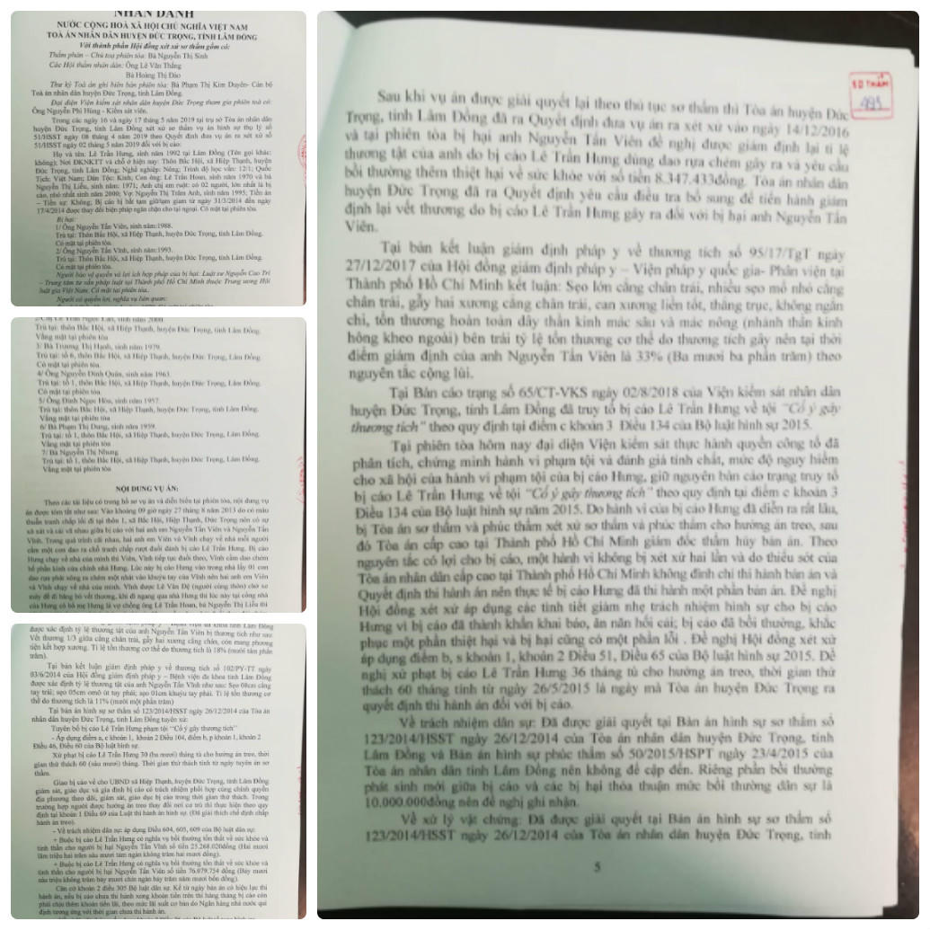 Tại bản án sơ thẩm (vòng tố tụng thứ nhất) ngày 26/12/2014, TAND huyện Đức Trọng kết án Lê Trần Hưng 30 tháng tù treo về tội “Cố ý gây thương tích”, thời gian thử thách 60 tháng. Tòa cũng tuyên buộc bị cáo phải bồi thường cho các bị hại và tuyên giao bị cáo cho địa phương quản lý, giáo dục.