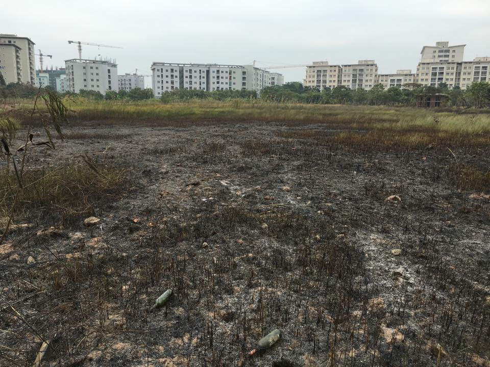 Sáng 30/11, phóng viên tìm đến nơi xảy ra cháy, cỏ lau mọc um tùm ở khu đất trống rộng cả nghìn m2 đã bị cháy rụi. Xung quanh bãi đất trống có nhiều ngôi nhà cao tầng.