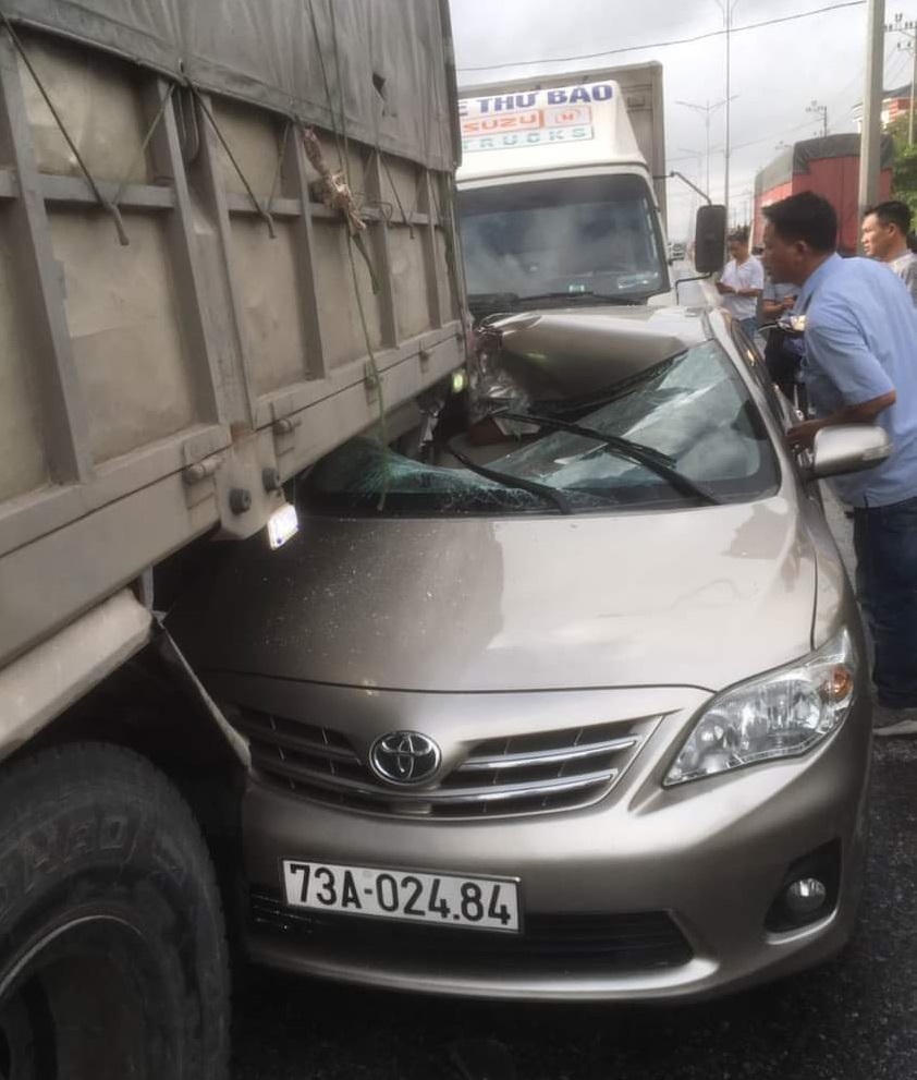 Theo người dân chứng kiến, thời điểm trên, 2 xe đang dừng chờ đèn đỏ theo hướng Nam - Bắc gồm xe tải và xe ô tô con. Bất ngờ xe thư báo mang biển KS 43H-018.45 từ phía sau lao tới húc xe con dồn về phía trước.