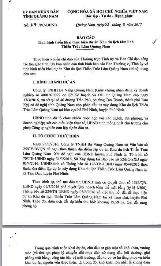 Do đó, báo cáo nêu, Công ty TNHH Ba Vàng Quảng Nam dừng thực hiện dự án Khu du lịch Thiền Trúc Lâm Quảng Nam, Công ty có trách nhiệm tiến hành các thủ tục liên quan theo quy định.