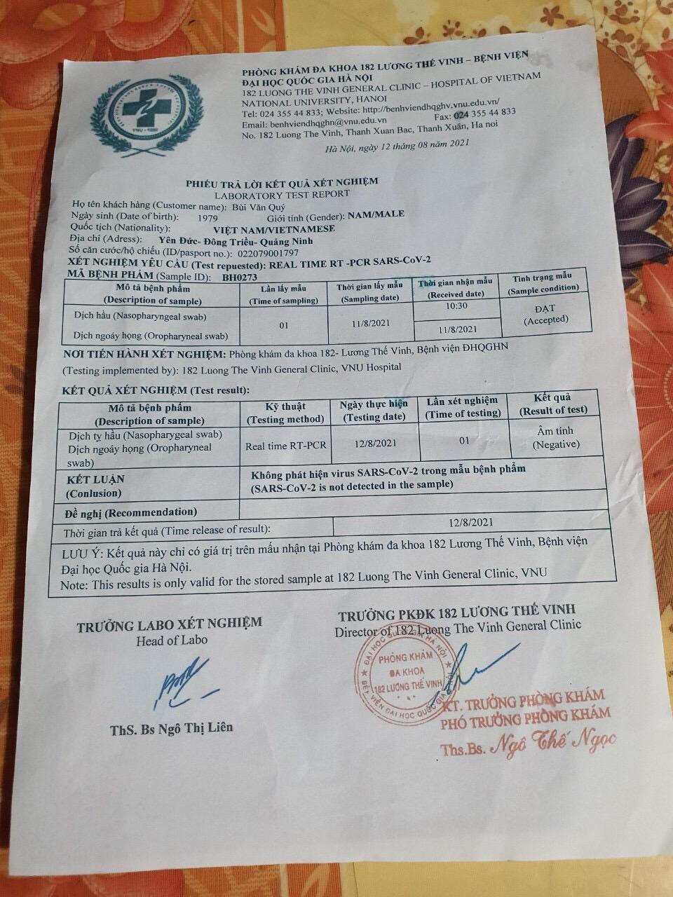 Làm việc với lực lượng chức năng tại chốt kiểm dịch, 04 người trên đã xuất trình Phiếu xét nghiệm COVID-19 có kết quả "Âm tính" do Phòng khám đa khoa 182 Lương Thế Vinh - Bệnh viện Đại học Quốc gia Hà Nội cấp. Tuy nhiên, quá kiểm tra, lực lượng chức năng xác định đây đều là các phiếu giả mạo.