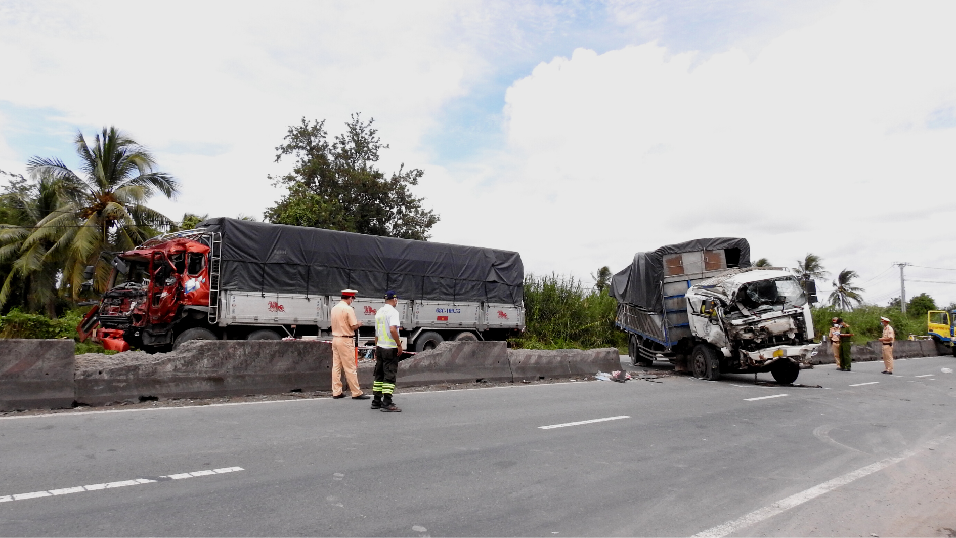 Cụ thể vụ tai nạn xảy ra vào lúc 18h00 ngày 11/10 tại km 2002 Quốc lộ 1 thuộc ấp 5, xã Phú An, thị xã Cai lậy, tỉnh Tiền Giang. Tài xế L.T.H sinh năm 1986, ngụ Khu phố 1, phường Pháo Đài, Hà Tiên, Kiên Giang điều khiển xe ô tô tải mang BKS 68C-109.xx lưu thông theo hướng Trung Lương – Mỹ Thuận khi đến địa điểm trên thì va chạm với xe ô tô tải mang BKS 54Z-04xx do tài xế T.T.H sinh năm 1988, ngụ khu phố 3, phường Bình Sang, Hà Tiên, Kiên Giang điều khiển lưu thông theo hướng ngược lại và trên xe có chở L.T.V sinh năm 1988 ngụ cùng địa chỉ.
