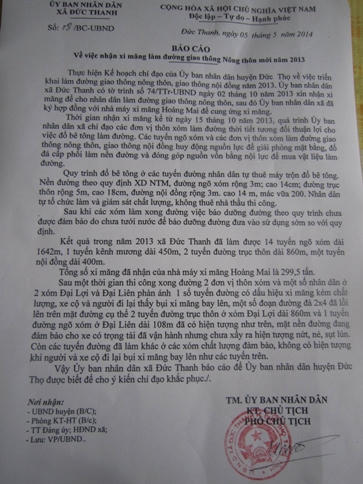 Theo Báo cáo số 08 của UBND xã Đức Thanh gửi UBND huyện Đức thì: thời gian nhận xi măng từ 15/10/2013, xã đã chỉ đạo các đơn vị thôn xóm làm đường, thời tiết tương đối thuận lợi…Kết quả, năm 2013 xã Đức Thanh làm được 14 tuyến ngõ xóm, dài 1.642m, 1 tuyến kênh mương dài 450m, 2 tuyến đường trục thôn dài 860m, 1 tuyến nội đồng 400m. Tổng số xi măng đã nhận của Nhà máy xi măng Hoàng Mai là 299,5 tấn. Sau một thời gian thi công đường đơn vị, thôn xóm một số nhân dân ở Đại Liên, Đại Lợi phản ánh một số tuyến đường có dấu hiệu xi măng kém chất lượng, xe cộ và người đi lại thấy bụi bay lên, một số đoạn đường đá 2x4 lồi lên trên bề mặt…còn mặt đường chưa có hiện tượng nứt nẻ, sụt lún…