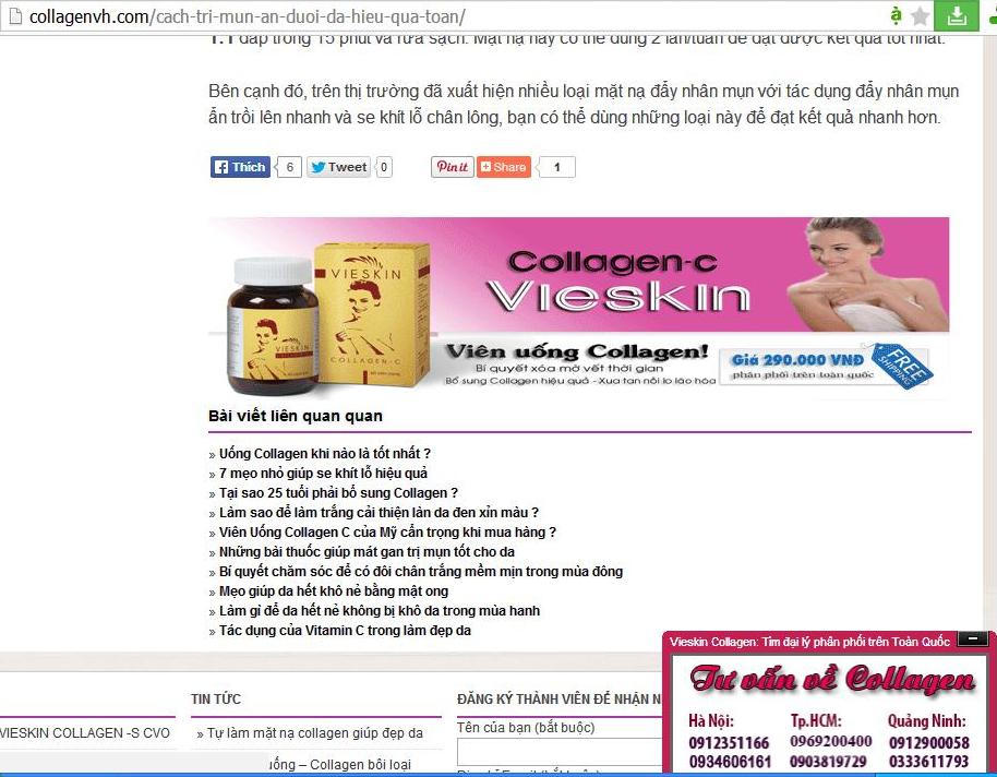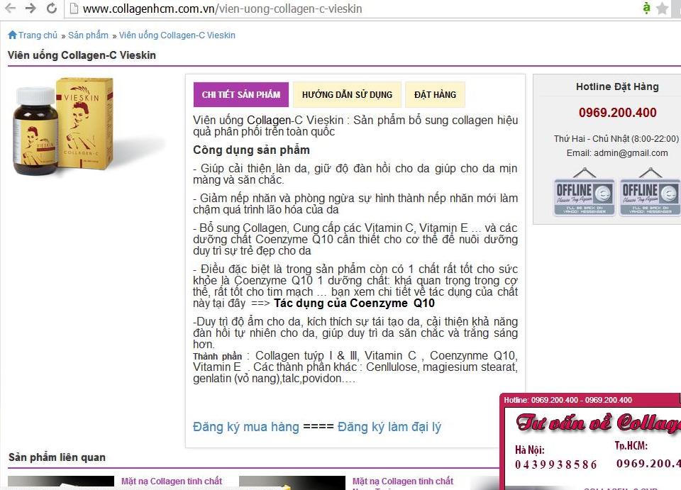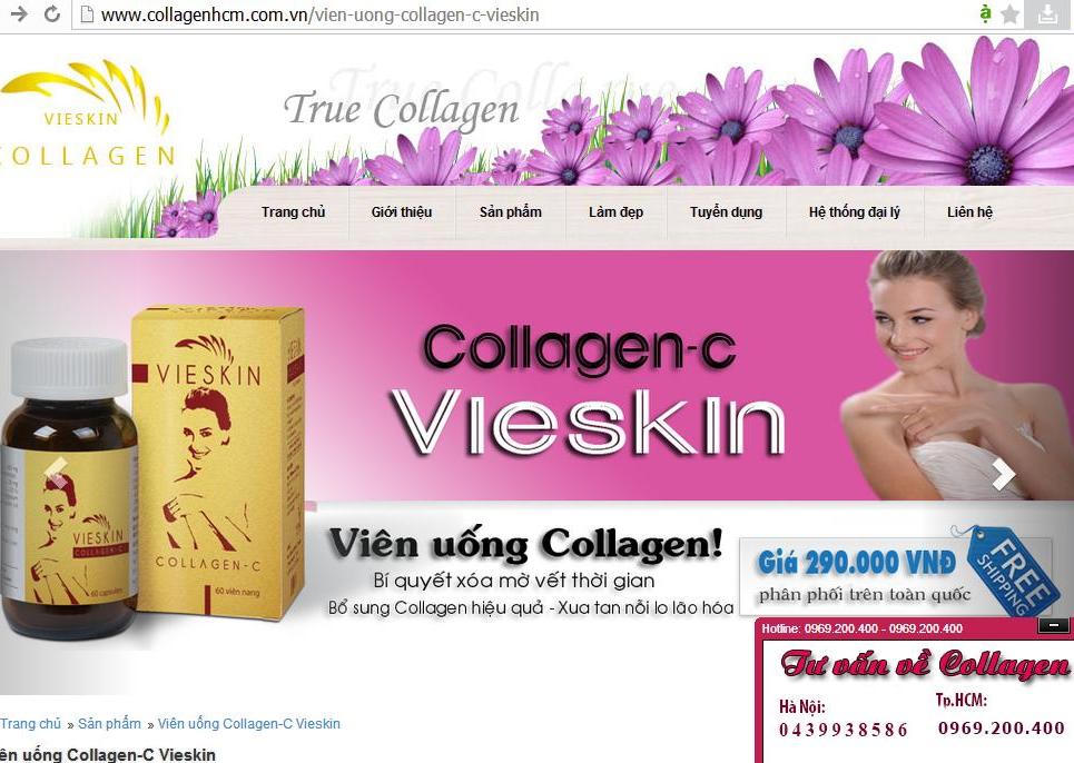 Tuy nhiên, theo điều tra của PV, vào thời điểm 20h ngày 11/1/2015, trên trang thông tin điện tử Collagenvh.com vẫn còn nội dung quảng cáo sản phẩm thực phẩm chức năng viên nang Vieskin Collagen-C.
