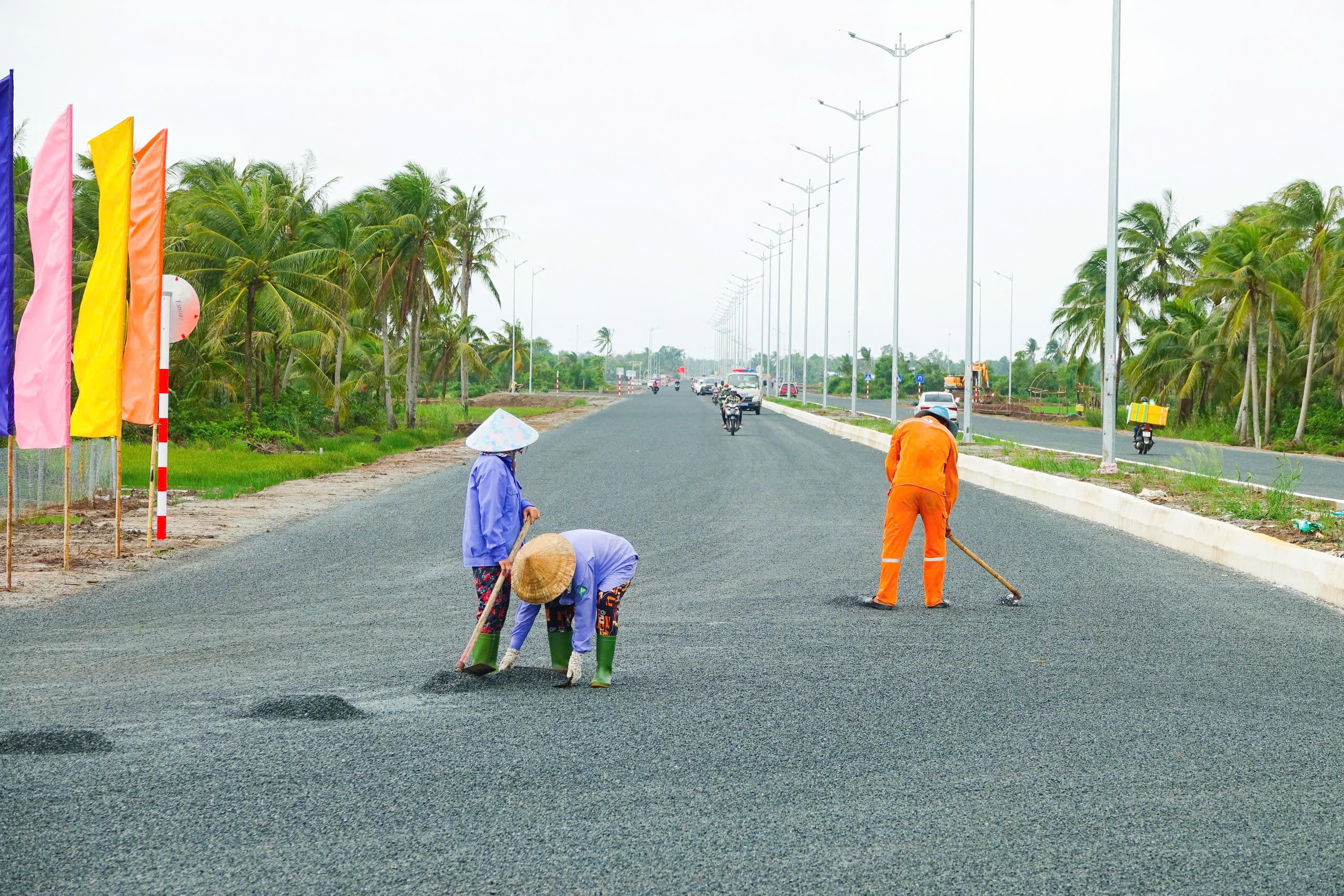 Cờ hoa treo rực rỡ trước ngày thông xe chính thức đường 3 tháng 2 nối dài ở Kiên Giang. |