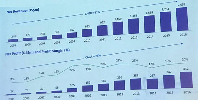 Trong 10 năm, doanh thu thuần của VNM đã tăng gấp 7,6 lần đạt 46.794 tỷ đồng năm 2016, tăng trưởng bình quân 21%/năm. Lợi nhuận ròng 2016 đạt 9.350 tỷ đồng, tăng gấp 12 lần, tương đương tăng trưởng bình quân 28%/năm.