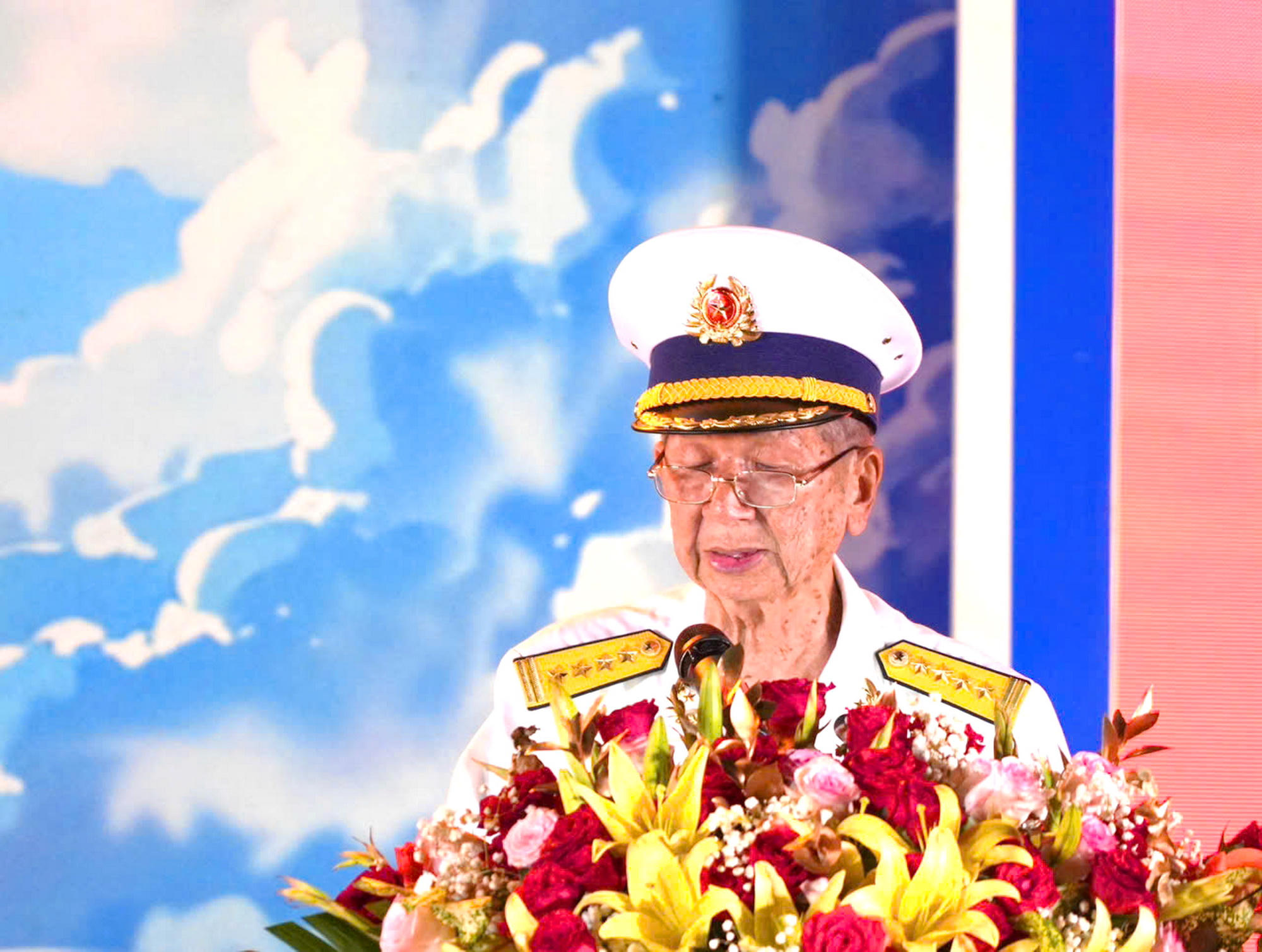Đại tá Khưu Ngọc Bảy - nguyên Trung đoàn trưởng Trung đoàn 962, nguyên Phó Chủ tịch Hội truyền thống đường Hồ Chí Minh trên biển, phát biểu tại buổi Lễ. |