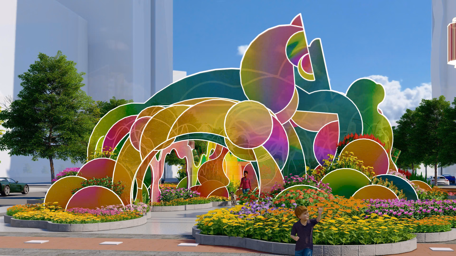 Nổi bật là đại cảnh “Ngựa chín hồng mao” cao 6,4m, lấy cảm hứng từ truyền thuyết Sơn Tinh – Thủy Tinh. “Chín hồng mao” mang ý nghĩa viên mãn – cát tường – trọn vẹn, kết hợp hiệu ứng sơn chuyển màu tạo nên không gian sắc màu biến đổi theo từng góc nhìn.
