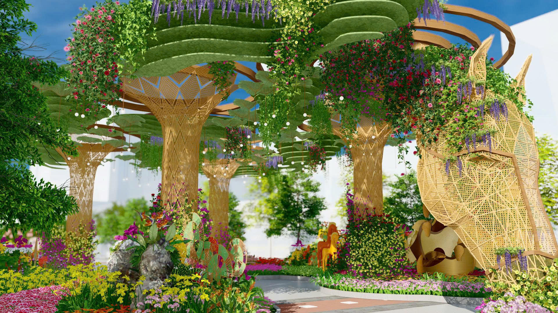 Điểm nhấn khác là “Nhất mã thong dong” – linh vật lớn nhất Đường hoa, cao gần 7m, được chế tác từ tre đan hình học thân thiện môi trường, tạo nên không gian sinh thái đa tầng để du khách trải nghiệm sự thư thái, thong dong ngày xuân.