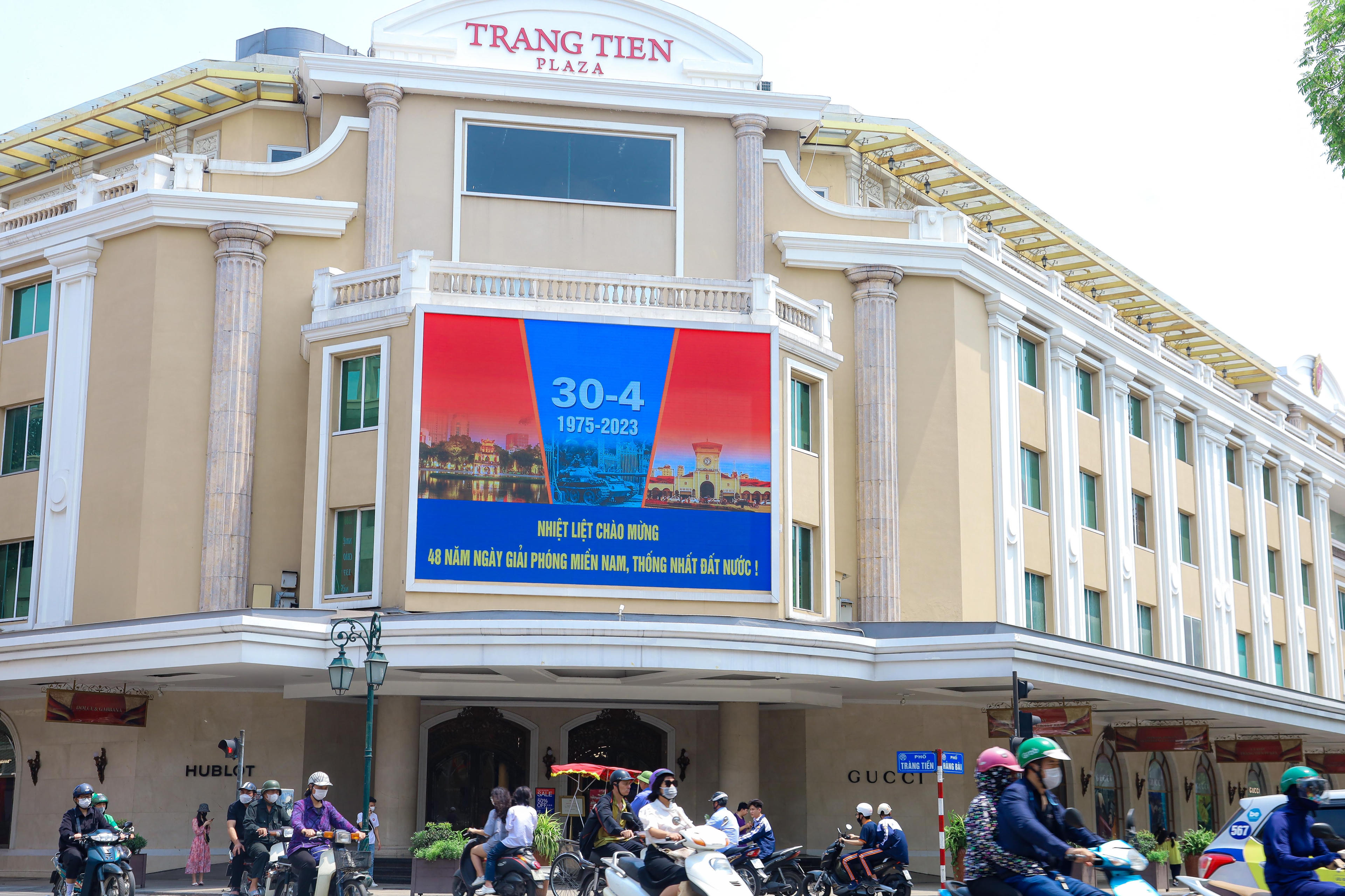Màn hình led trước Trung tâm thương mại Tràng Tiền (quận Hoàn Kiếm) trình chiếu các hình ảnh chào mừng kỷ niệm 30/4, 1/5. |