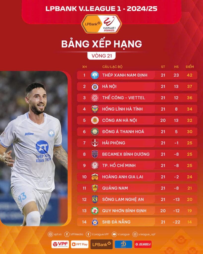 Ba điểm có được từ chiến thắng 3-0 trước Hà Nội FC đã giúp Thép Xanh Nam Định vững vàng ở ngôi đầu với 5 điểm cách biệt so với đội bóng Thủ đô, tạo ra lợi thế rất lớn cho nhà đương kim vô địch trong bối cảnh V.League chỉ còn lại 5 vòng đấu nữa là kết thúc.