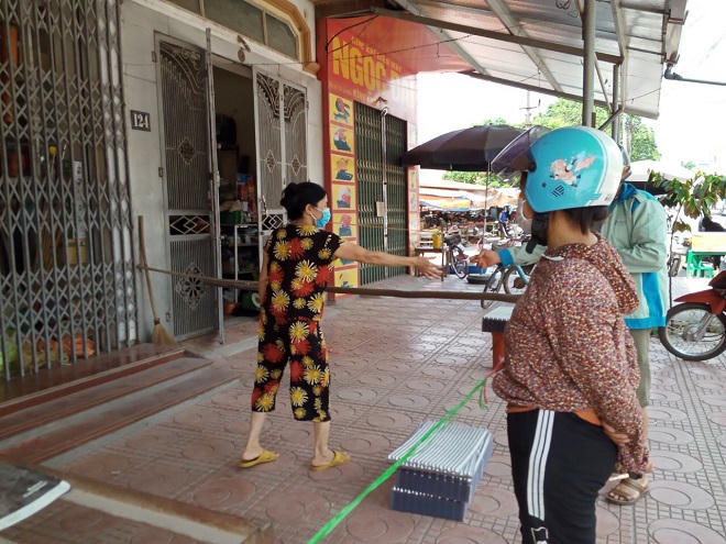 Chủ cửa hàng chăng dây đảm bảo khoảng cách với khách hàng, việc trao đổi, nhận tiền diễn ra nhanh chóng.