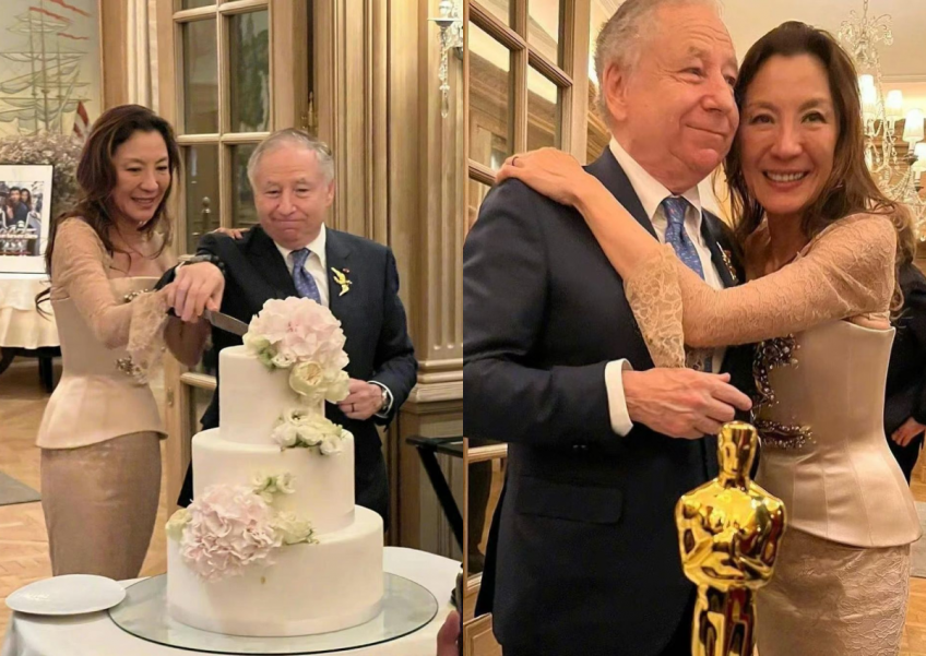 Có thể thấy trong ảnh, Dương Tử Quỳnh mặc váy dáng dài màu be sánh vai Jean Todt lịch lãm với vest, cùng cắt bánh cưới.
