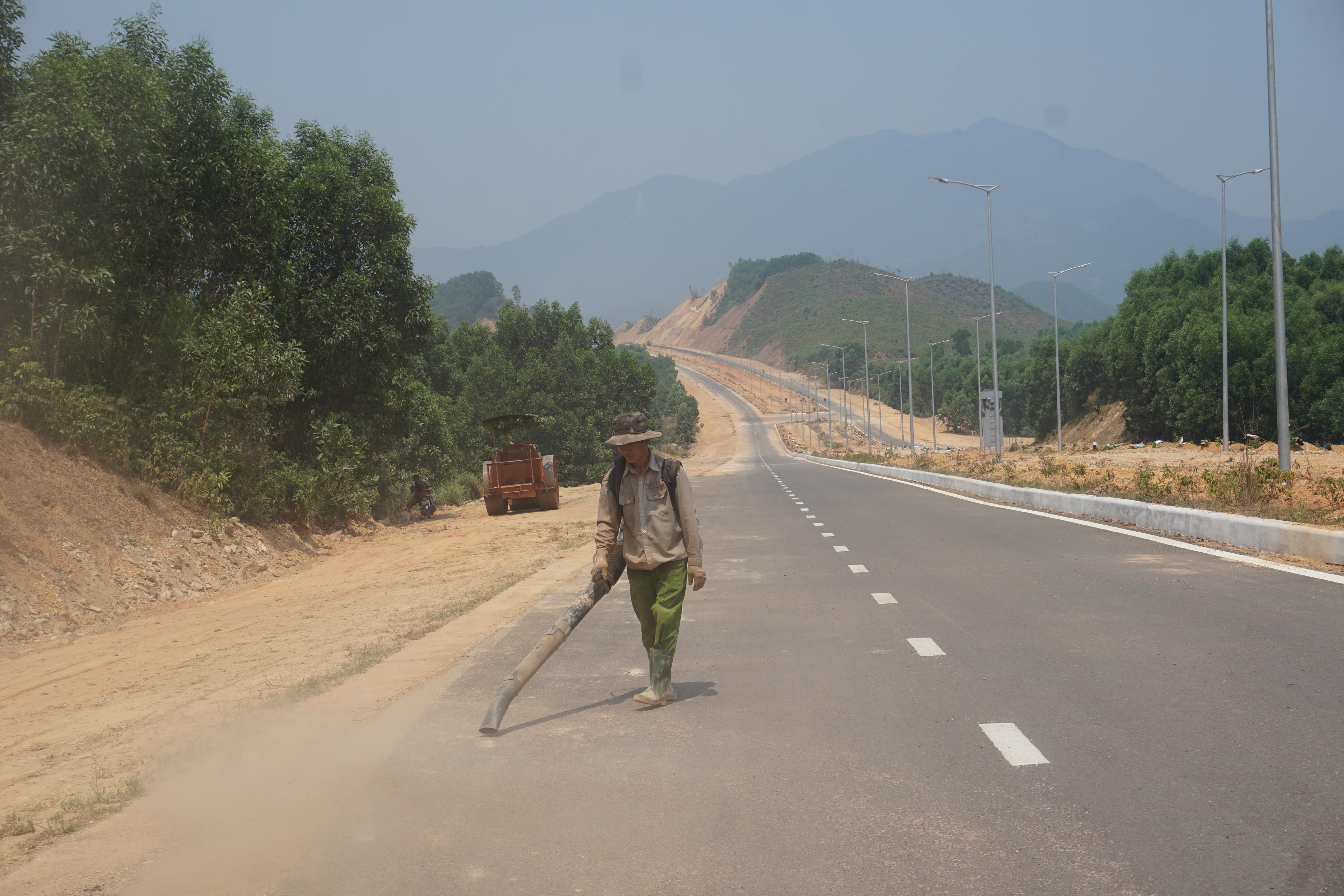 Các công nhân dùng máy thổi tiến hành làm sạch mặt đường để chuẩn bị cho các công đoạn tiếp theo.