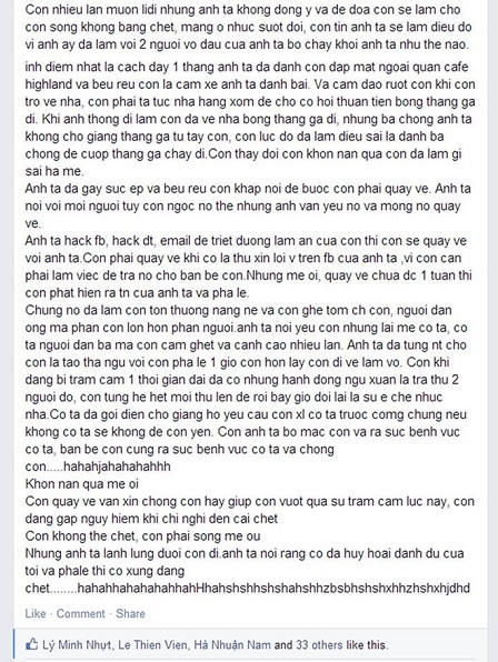 Cựu người mẫu giãi bày, sau khi vợ chồng mở quán ăn và làm ăn thua lỗ đến hơn tỷ đồng, cô trở thành trụ cột kiếm tiền nuôi sống gia đình. Ban đầu, Trần Thông cũng vay mượn xoay tiền giúp vợ trả nợ, tuy nhiên sau khi sinh con trai, cuộc đời cô bắt đầu trở thành bi kịch: "Ngay trong tháng đầu tiên anh ấy đã đánh con dã man vì ghen. Anh ấy có thể ghen với bất kỳ ai và mỗi lần đánh đập con, con bỏ đi, anh Thông đã bêu rếu con với bạn bè... Con nhiều lần muốn ly dị nhưng anh ta không đồng ý và dọa sẽ làm cho con sống không bằng chết, mang nhục suốt đời. Con tin anh ta sẽ làm điều đó vì anh ấy đã làm với 2 người vợ đầu của anh ta...".