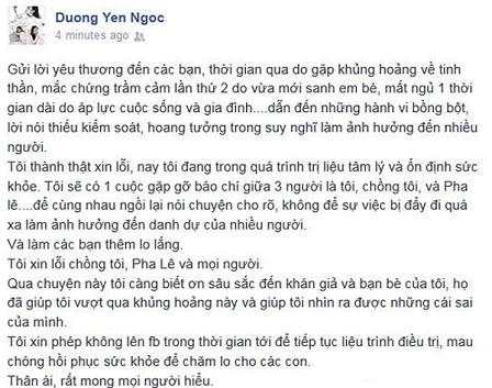 "Qua chuyện này tôi càng biết ơn sâu sắc đến khán giả và bạn bè của tôi, họ đã giúp tôi vượt qua khủng hoảng này và giúp tôi nhìn ra được những cái sai của mình. Tôi xin phép không lên facebook trong thời gian tới để tiếp tục liệu trình điều trị, mau chóng hồi phục sức khỏe để chăm lo cho các con", Dương Yến Ngọc viết những dòng cuối, khép lại vụ tố chồng lăng nhăng, gây ồn ào trên báo chí và mạng xã hội mấy ngày qua. Tâm thư gửi mẹ bày tỏ ý định tự tử và các status tố chồng vụng trộm với Pha Lê cũng đã được xóa khỏi facebook cá nhân của cô.