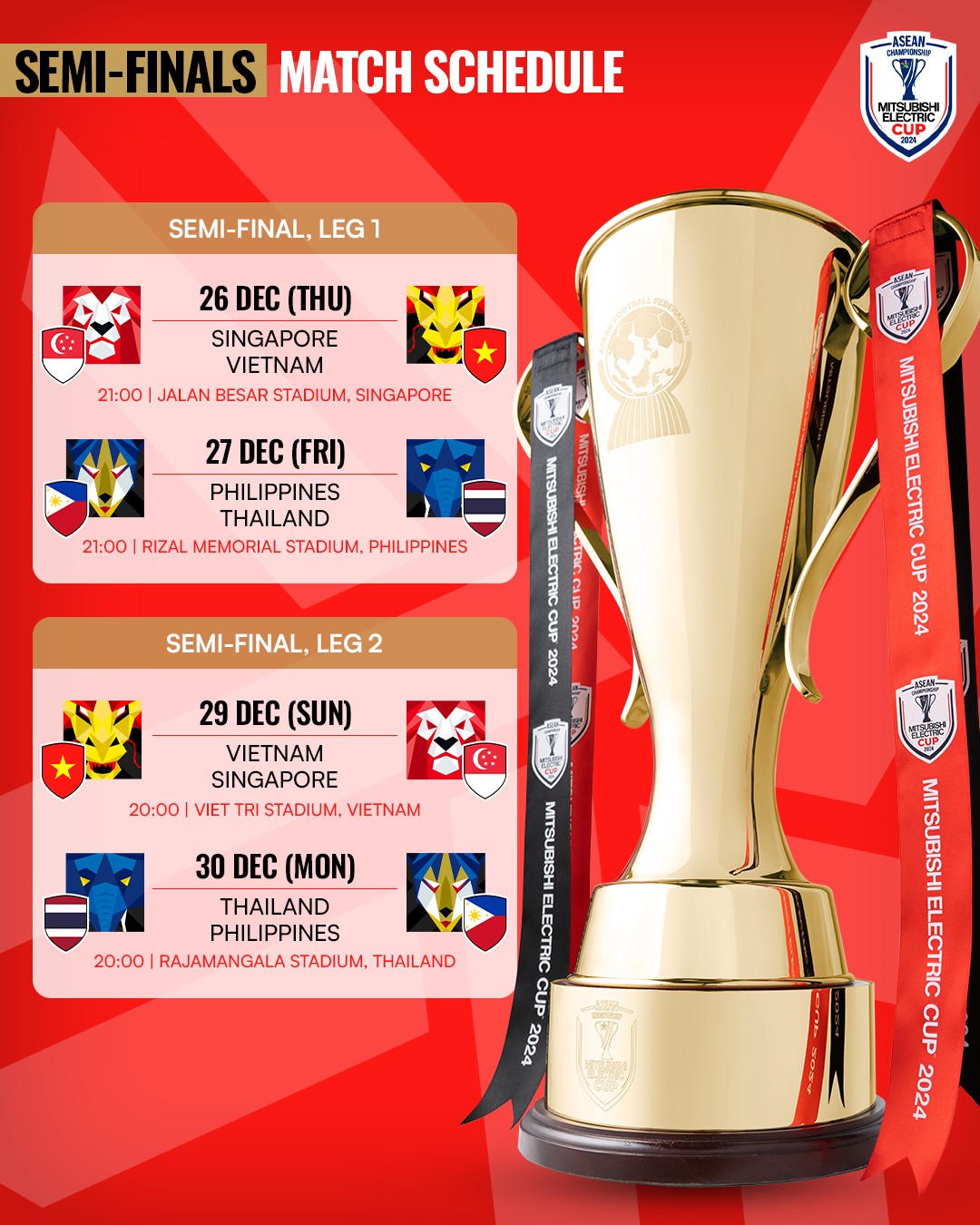 Tối 23/12, đội tuyển Việt Nam sẽ có buổi tập đầu tiên tại tập đầu tiên tại Singapore để làm quen với điều kiện thời tiết và sân bãi. Hiện tại, Singapore đang có mưa nhẹ và nhiệt độ dao động từ 25 đến 30 độ C.