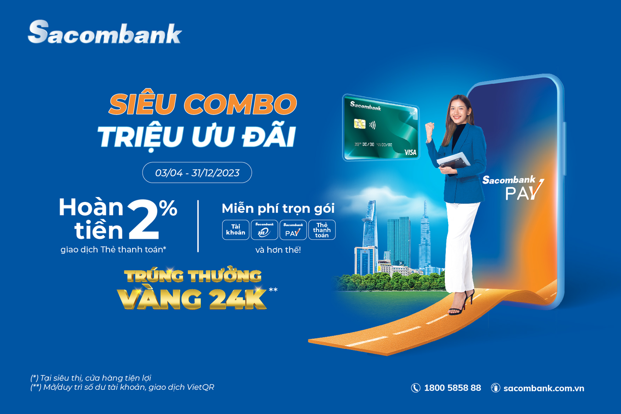 Như tại Sacombank vừa triển khai mới gói Combo Đa Lợi cung cấp trọn gói các sản phẩm dịch vụ ngân hàng hiện đại bao gồm: tài khoản thanh toán, thẻ thanh toán, Internet Banking/Mobile Banking/Sacombank Pay, tin nhắn thông báo giao dịch qua ứng dụng Mobile Banking/Sacombank Pay với mức phí thấp (20.000 đồng/tháng), nhưng có hạn mức chuyển tiền lên đến 10 tỷ đồng/giao dịch/ngày. Tuy nhiên, khách hàng chỉ cần duy trì số dư bình quân tài khoản từ 1 triệu đồng/tháng là đã được miễn phí gói Combo này.